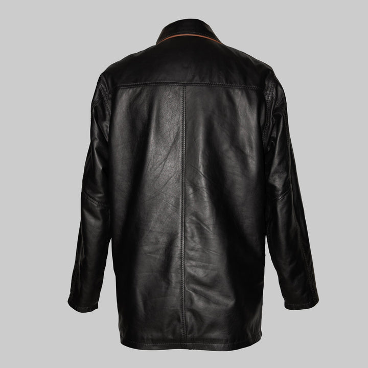 Ambassador - Men's Luxury Black Leather Coat with Tan Piping -Eco-Friendly Elegance
