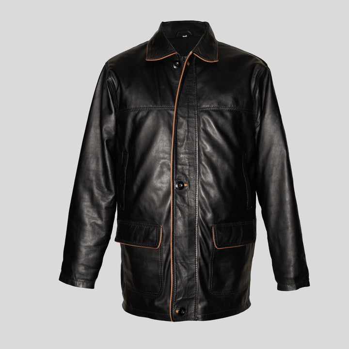 Elevate your look with this men's luxury black leather coat, meticulously crafted from high quality Nappa Lamb leather for a soft, premium feel. Designed with elegant tan piping along the zipper, pockets and collar, this coat blends timeless style with a modern touch. Ethically sourced from certified tanneries, it's a perfect choice that ensures quality and durability without a compromise. Choose this coat for a wardrobe staple that speaks to both style and values.